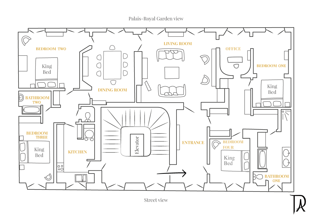 This amazingly spacious Parisian apartment is located in the Palais Royal monument itself and overlooks the sumptuous gardens. There are four bedrooms, one of which has splittable king size beds, an office space, two bathrooms, one of which has a separate WC, a spacious living room, a separate dinning room, a fully equipped kitchen. An extraordinary place to stay with it’s unmatched view onto the gardens through the immense French windows. The impressive living room with exceptionally high and beautifully molded ceilings are a vestige of the notable history of this building.