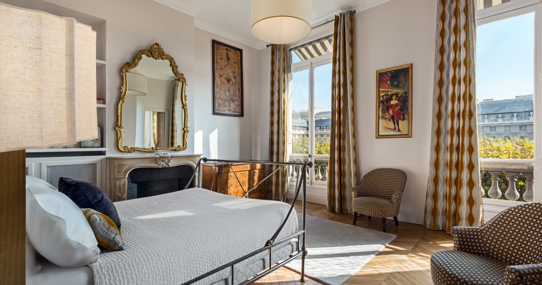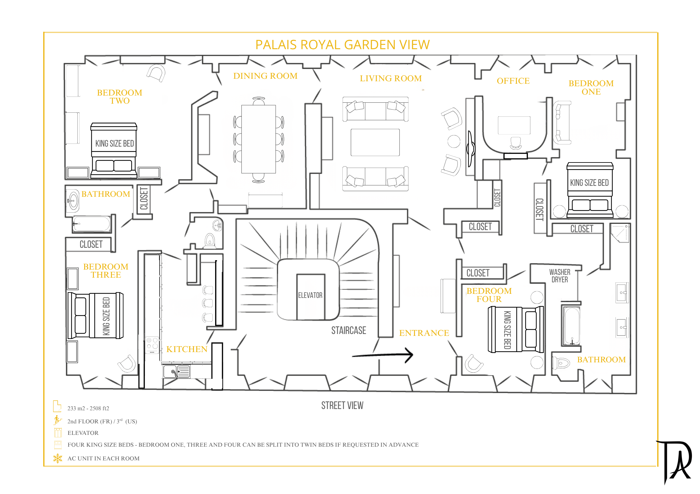 This amazingly spacious Parisian apartment is located in the Palais Royal monument itself and overlooks the sumptuous gardens. There are four bedrooms, one of which has splittable king size beds, an office space, two bathrooms, one of which has a separate WC, a spacious living room, a separate dinning room, a fully equipped kitchen. An extraordinary place to stay with it’s unmatched view onto the gardens through the immense French windows. The impressive living room with exceptionally high and beautifully molded ceilings are a vestige of the notable history of this building.
