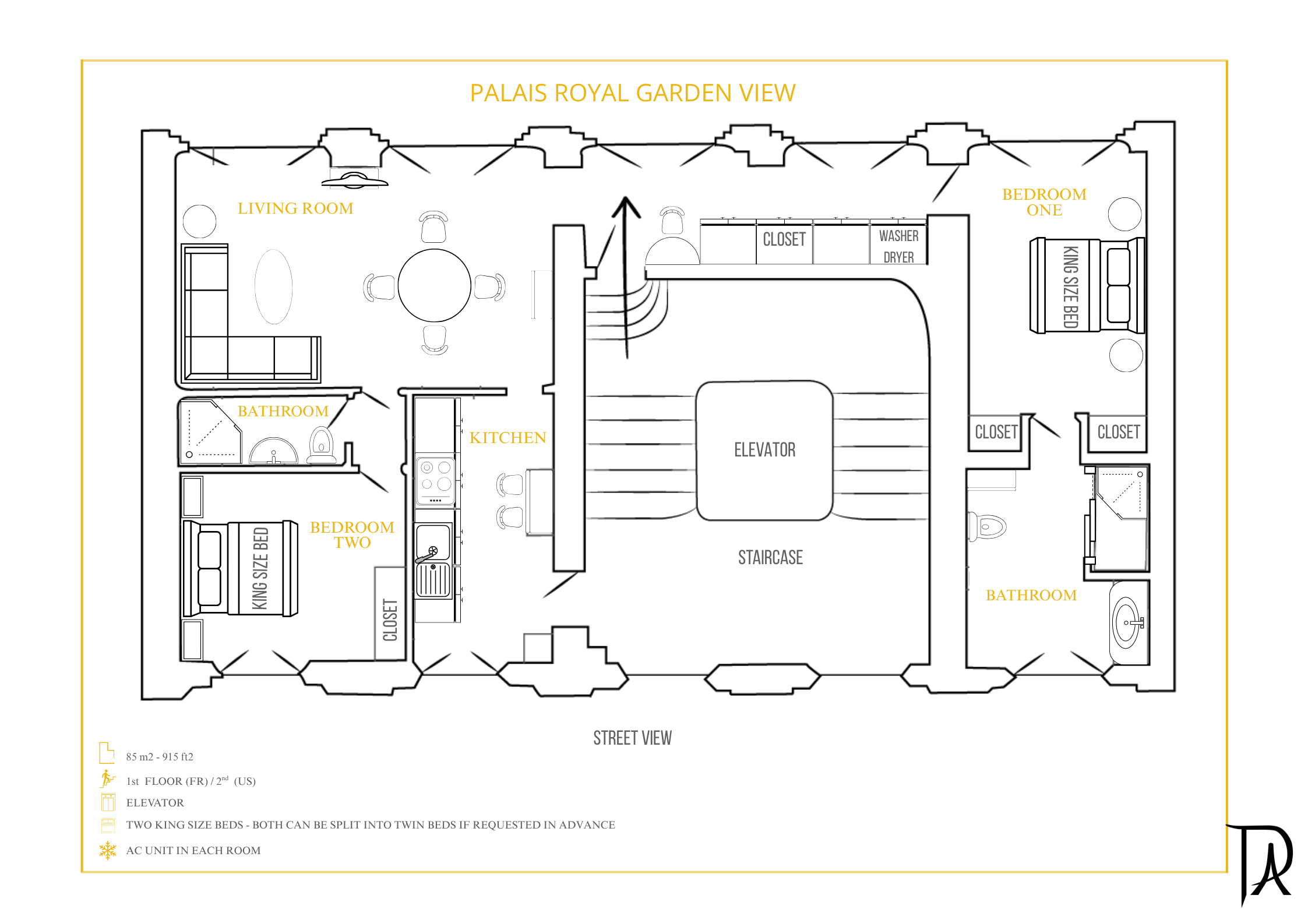 An extraordinary place to stay with it’s arcade view from the apartment windows overlooking the charming gardens and fountain of Palais Royal. This superb apartment has a perfect layout comprised of two bedrooms with a splittable king size bed and a splittable queen size bed and two ensuite bathrooms, a large modern living room and dinning area and a fully equipped kitchen. The apartment has been modernized to give maximum comfort and to make your stay so very elegant.
