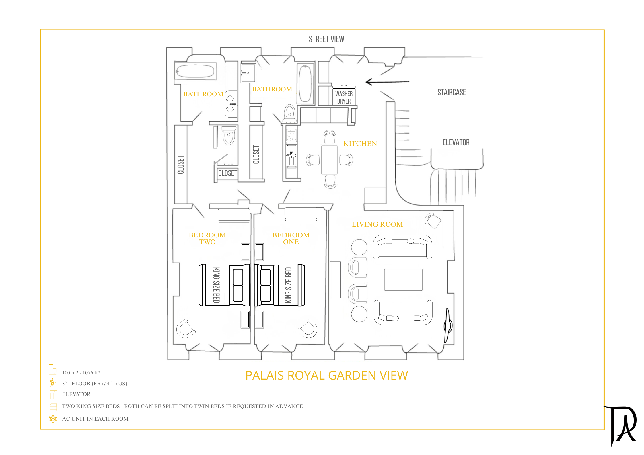 An extraordinary place to stay with it’s unmatched view from the apartment windows overlooking the charming gardens and fountain of Palais Royal. This superb apartment has a great and layout with two spacious bedrooms with splittable king size beds and two bathrooms, one of which has a separate WC, a grand living room and a fully equipped kitchen and dinning area. The apartment has been modernized to give maximum comfort and to make your stay memorable.
