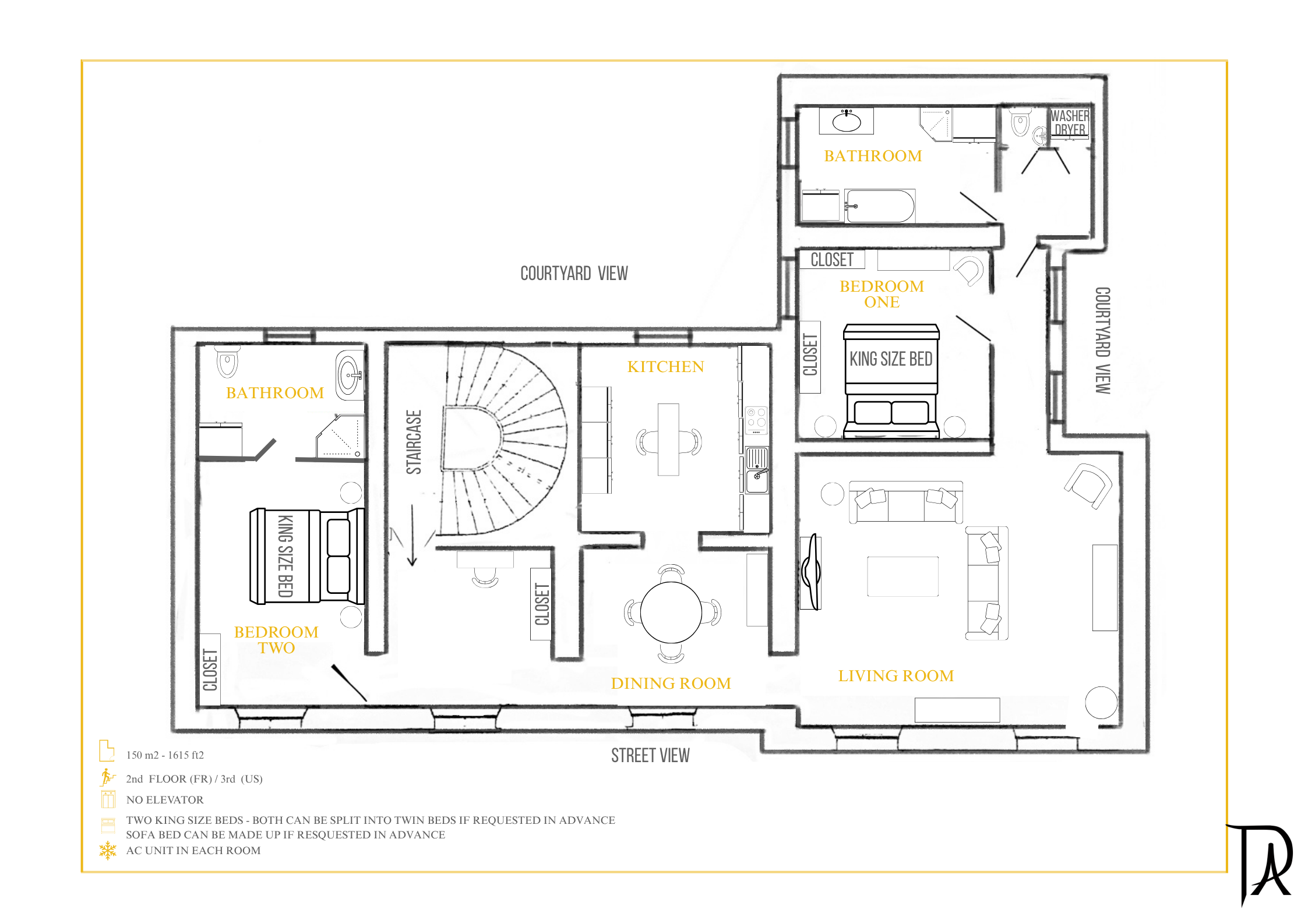 This superb, exquisite and spacious apartmentlocated in a nice building has a great layout comprised of two bedrooms, which have splittable king size beds and two en suite bathrooms. There is a nice and bright living room, a separate dining room area and a fully equipped kitchen. Rue Elzévir is situated in the Marais, a historic and aristocratic district of Paris with many outstanding buildings of architectural and historical importance. The apartment has been entirely renovated and modernized to give maximum comfort and to make your stay unforgettable.