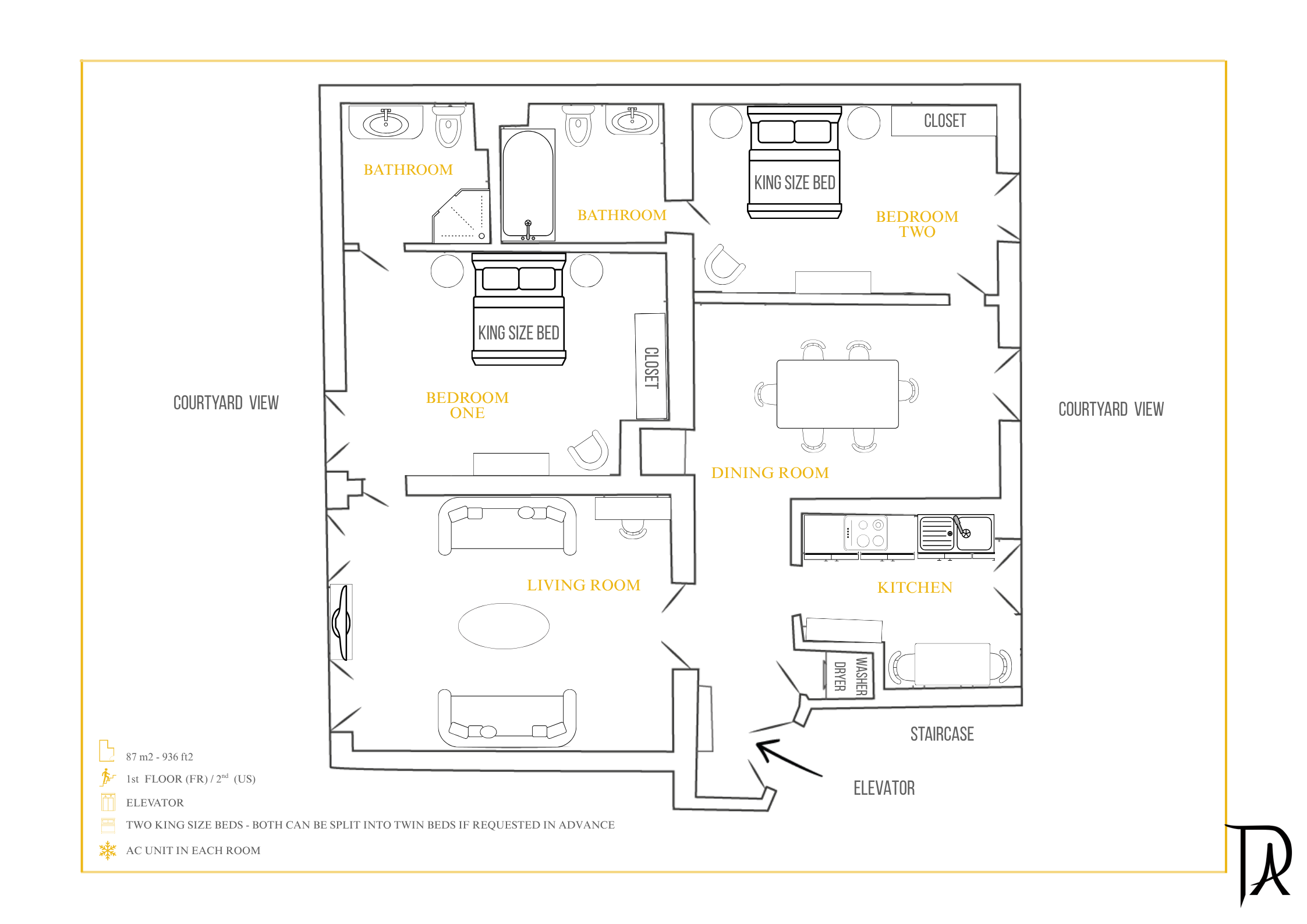 We were 1 couple and 2 friends. The layout worked perfectly for us. One bedroom had a King bed (nearest courtyard) and the second bedroom (nearest the garden) had a King bed that was split into 2 twin beds for us. Each bedroom had its own bathroom. The living room was a nice size for us all to relax and discuss our day. There was a desk and computer in the corner of the living room. The dining room sat 6 people but we rarely used it … we mostly cooked, talked and ate in the kitchen. The apartment was exactly as described and pictured on the website. The apartment was stocked with essentials and well appointed. Fred met us at the front door when we arrived. The last couple left fruit in the kitchen, the rental company supplied wine, flowers and croissants. My sister/husband really enjoyed walking out the apartment and strolling down rue Buci. I enjoyed being so close to the RER line and Metro lines 4 and 10. All emails were answered promptly and they were kind enough to make